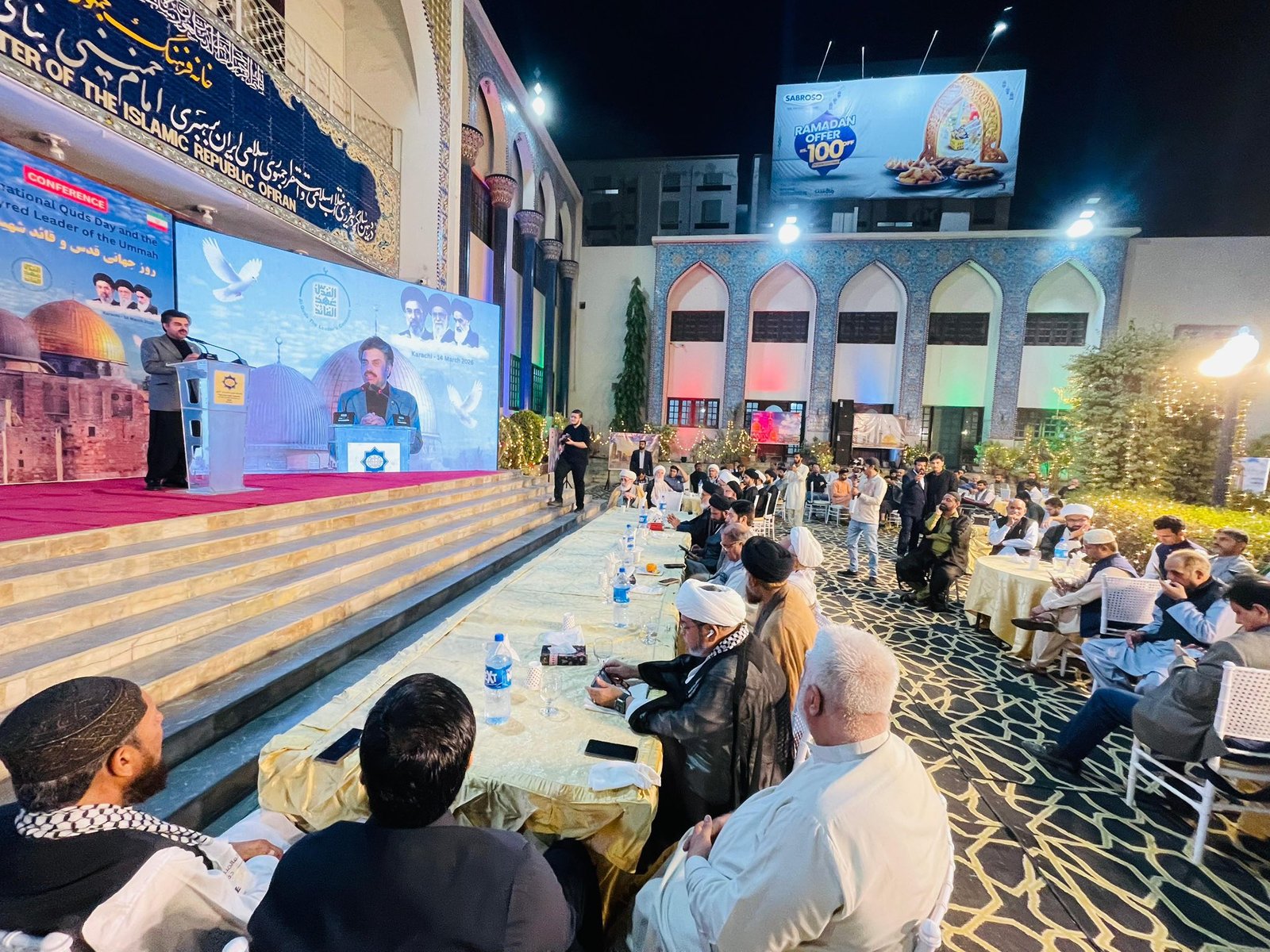 کونسل جنرل ایران جناب اکبر عیسیٰ زادی نے سید ناصر حسین شاہ کو خوش آمدید کہا۔ اس موقع پر تقریب میں دیگر معزز شخصیات بھی شریک تھیں۔ مقررین نے یوم القدس کے موقع پر فلسطینی قوم اور قدس کی مکمل حمایت کا اعلان کرتے ہوئے بیت المقدس اور فلسطین پر اسرائیلی جارحیت کی مذمت کی۔ سید ناصر حسین شاہ کا اپنے خطاب میں کہنا تھا کہ پاکستانی قوم بیت المقدس اور فلسطینیوں کی حمایت ہمیشہ جاری رکھے گی۔