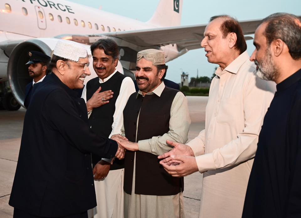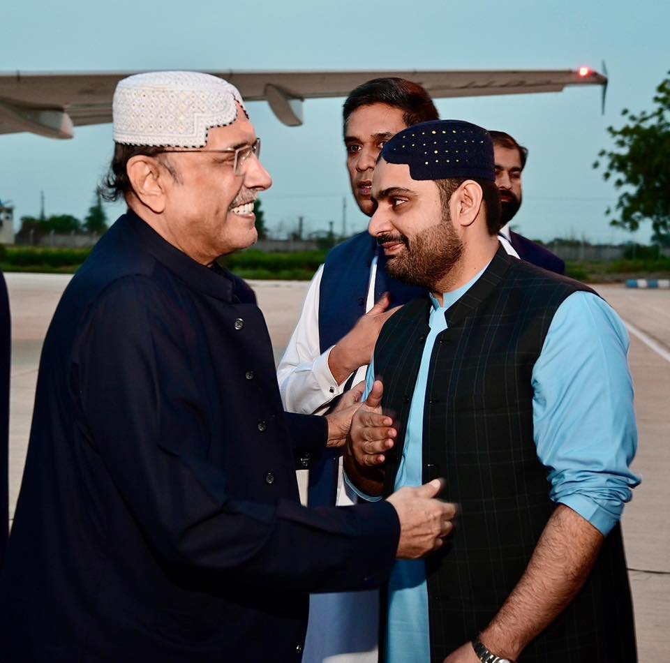 سکھر: صدرِ مملکت آصف علی زرداری نوابشاہ سے سکھر پہنچے، جہاں ایئرپورٹ پر پیپلز پارٹی کے سینیئر رہنماء اور ممبر قومی اسمبلی سید خورشید احمد شاہ، صوبائی وزیر سید ناصر حسین شاہ، اسپیکر سندھ اسمبلی سید اویس قادر شاہ، امتیاز شیخ، چیئرمین ڈسٹرکٹ کونسل سکھر سید کمیل حیدر شاہ، نعمان اسلام شیخ، میئر سکھر ارسلان شیخ اور دیگر اعلیٰ عہدیداران نے ان کا پرتپاک استقبال کیا۔